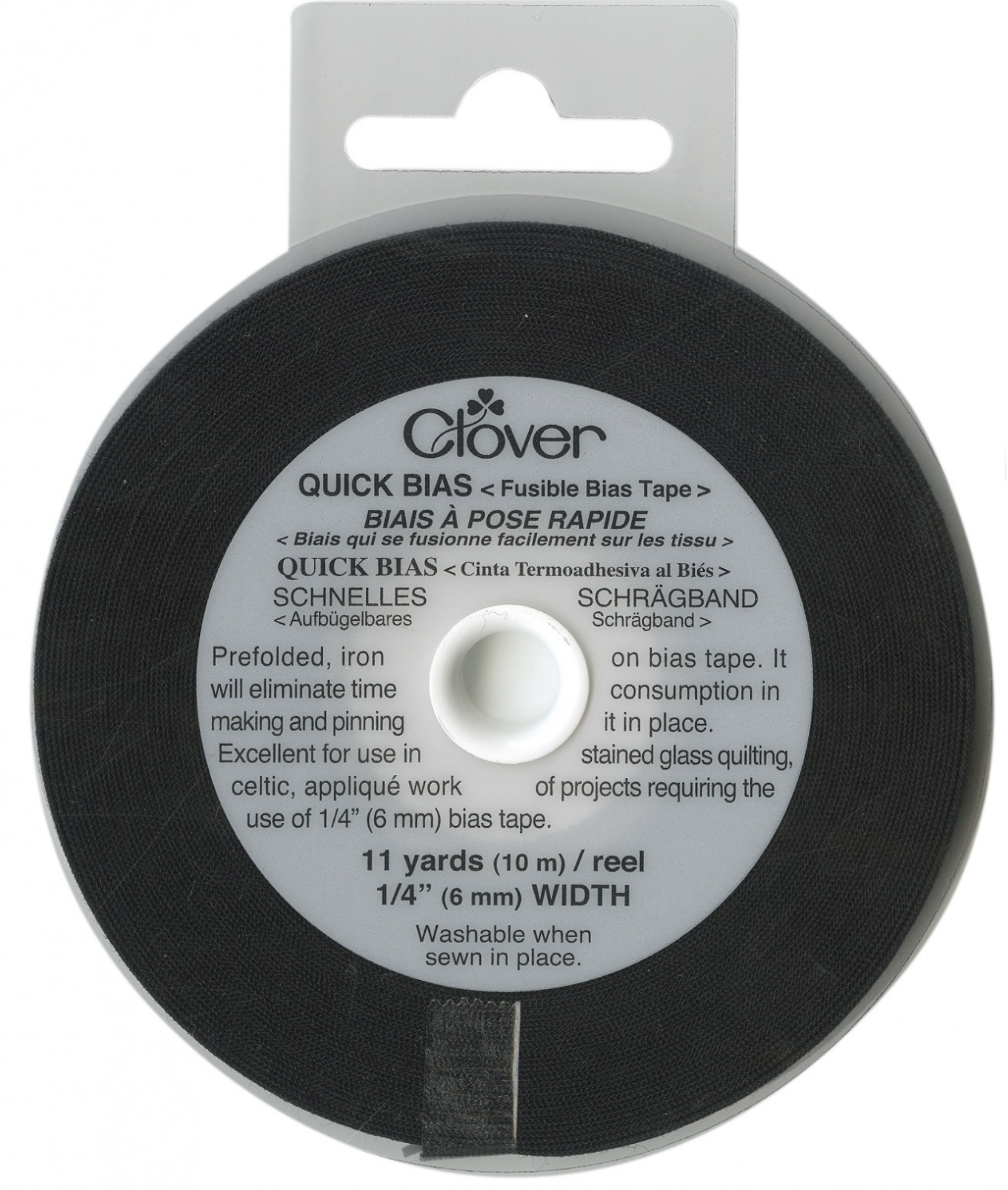 Clover Easily ironed on to straight or curved fabric designs. It will eliminate time consumed in making and pinning it in place. Excellent for use in stained glass quilting, celtic, applique work or projects requiring the use of (1/4″) bias tape. Quick Bias Tape in 11 yards (10 meters) / reel
