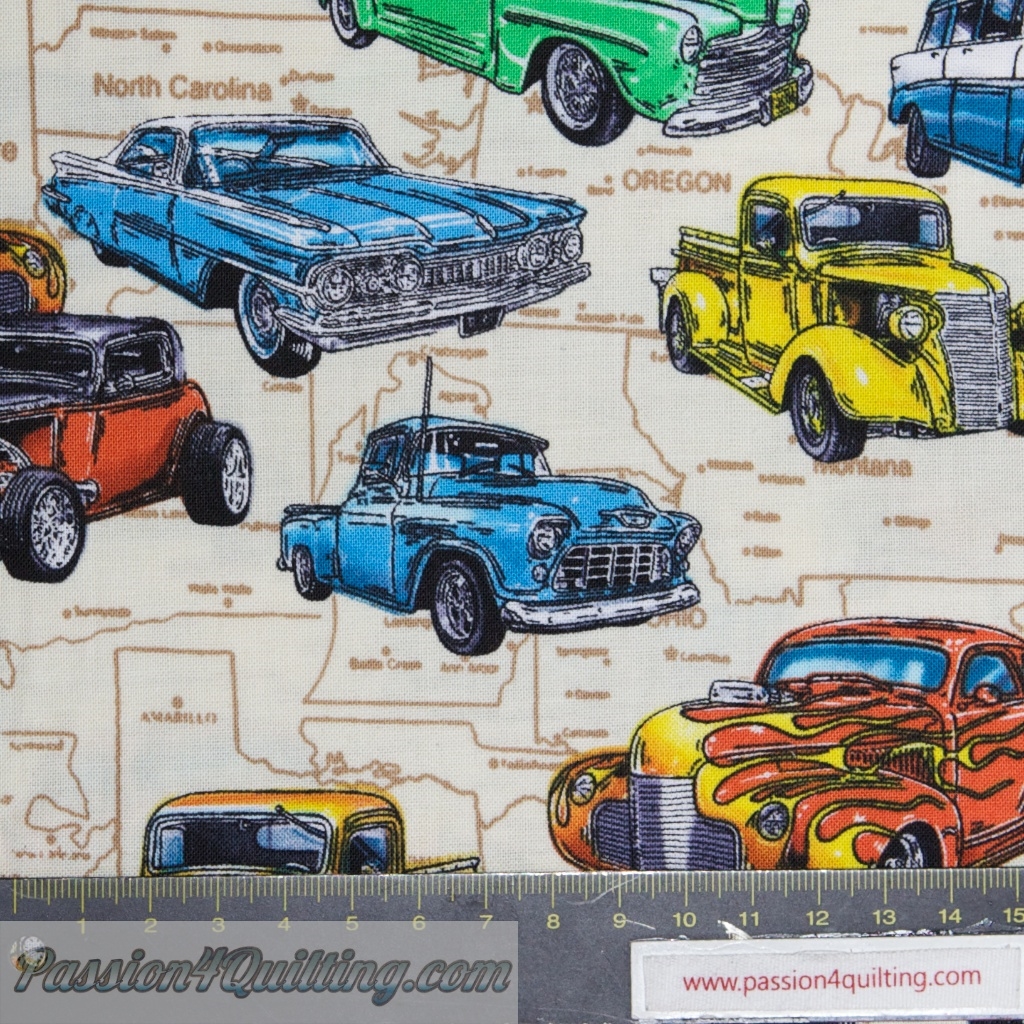 From Robert Kaufman fabrics “On the road” 9902. A cream background with American cars on a American state map. 100% cotton and 106cm wide. Sold in multiples of 25cm. To order 1 metre simply add 4 to the quantity.