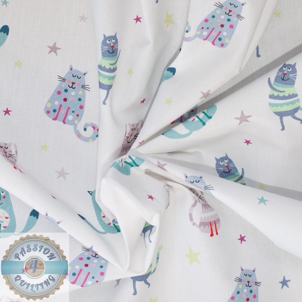 From JDC Fabrics. Made in Spain Petit Kids spaced out cats 51895 A white background with cute cats 2.5cm tall spaced out on a white backgrounnd with various colour and size stars in between. 150cm wide and 100% cotton. Sold in multiples of 25cm to order 1 metre add 4 to quantity